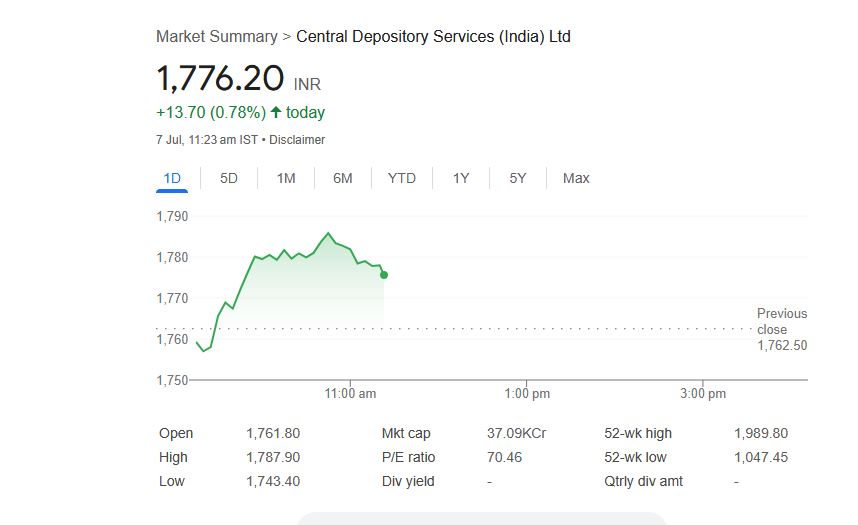 - CDSL शेयर 0.78% चढ़कर ₹1776.20 पर कारोबार करता दिखा।