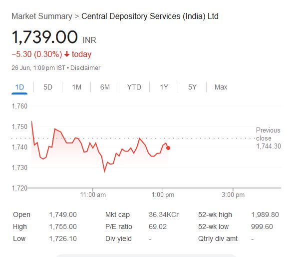 CDSL Share Price: गुरुवार, 26 जून 2025 दोपहर 1:09 PM तक स्टॉक मार्केट बीएसई का 30 शेयरों वाला संवेदी सूचकांक करीब 459.10 पॉइंट्स या 0.55 फीसदी उछलकर 83,214.61 पर पहुंच गया। वही, NSE निफ्टी 136.90 पॉइंट्स या 0.54 फीसदी उछलकर 25,381.90 पर ट्रेड कर रहा है।