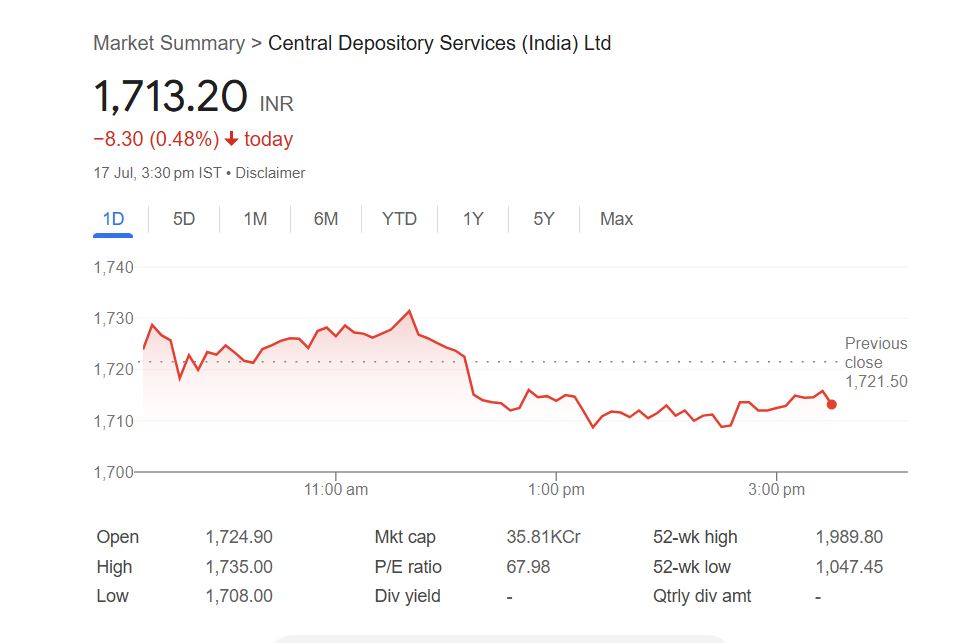 - CDSL शेयर आज ₹1713.20 पर बंद हुआ, हल्की गिरावट।