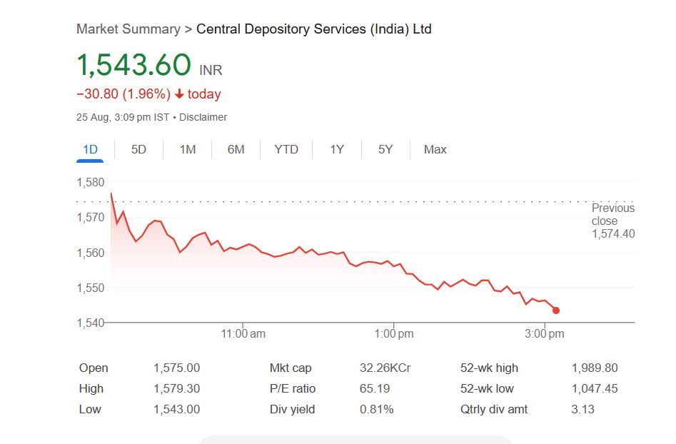 आज, सोमवार, 25 अगस्त 2025 के दिन सेंट्रल डिपॉजिटरी सर्विसेज (इंडिया) लिमिटेड कंपनी का शेयर -1.96 प्रतिशत की गिरावट के साथ 1543.60 रुपये पर कारोबार कर रहा है। सोमवार को सुबह शेयर बाजार में ट्रेडिंग शुरू होते ही सेंट्रल डिपॉजिटरी सर्विसेज (इंडिया) शेयर 1575 रुपये पर खुला था। जो आज दोपहर 3.09 बजे तक सेंट्रल डिपॉजिटरी सर्विसेज (इंडिया) कंपनी शेयर का हाई-लेवल 1579.30 रुपये और लो-लेवल 1543 रुपये था।