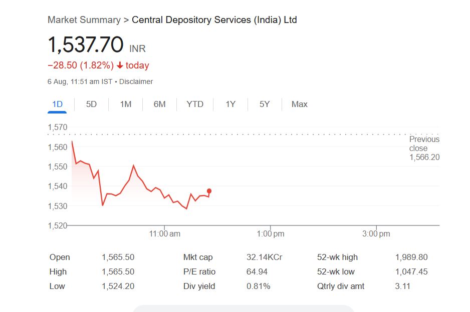 CDSL Share Price: आज, बुधवार, 6 अगस्त 2025 को सेंट्रल डिपॉजिटरी सर्विसेज (इंडिया) लिमिटेड कंपनी का शेयर 1.82% फिसलकर 1537.70 रुपये पर कारोबार कर रहा है। आज सुबह शेयर बाजार में ट्रेडिंग शुरू होते ही सेंट्रल डिपॉजिटरी सर्विसेज (इंडिया) शेयर 1565.50 रुपये पर खुला था। आज सुबह 11.51 बजे तक सेंट्रल डिपॉजिटरी सर्विसेज (इंडिया) कंपनी शेयर का इंट्रा डे हाई 1565.50 रुपये और लो-लेवल 1524.20 रुपये था।