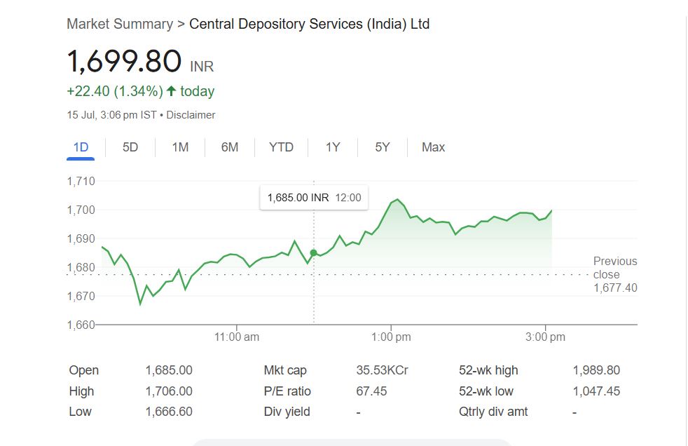 CDSL Share Price: आज, मंगलवार, 15 जुलाई 2025 को सेंट्रल डिपॉजिटरी सर्विसेज (इंडिया) लिमिटेड कंपनी का शेयर 1.34 प्रतिशत उछलकर 1699.80 रुपये पर कारोबार कर रहा है। आज सुबह शेयर बाजार में ट्रेडिंग शुरू होते ही सेंट्रल डिपॉजिटरी सर्विसेज (इंडिया) शेयर 1685 रुपये पर खुला था। आज दोपहर तक सेंट्रल डिपॉजिटरी सर्विसेज (इंडिया) कंपनी शेयर का हाई-लेवल 1706 रुपये और लो-लेवल 1666.60 रुपये रहा।