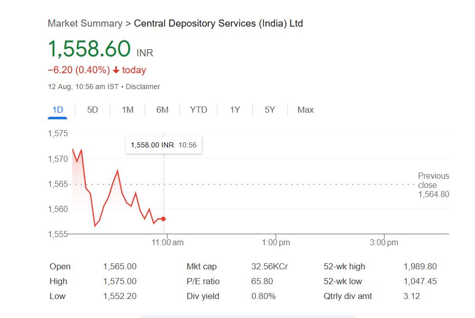आज, मंगलवार, 12 अगस्त 2025 के दिन सेंट्रल डिपॉजिटरी सर्विसेज (इंडिया) लिमिटेड कंपनी का शेयर 0.40% फिसलकर 1558.60 रुपये पर कारोबार कर रहा है। आज सुबह शेयर बाजार में ट्रेडिंग शुरू होते ही सेंट्रल डिपॉजिटरी सर्विसेज (इंडिया) शेयर 1565 रुपये पर खुला था। जो आज सुबह 10:56 बजे तक सेंट्रल डिपॉजिटरी सर्विसेज (इंडिया) कंपनी शेयर का हाई-लेवल 1575 रुपये और लो-लेवल 1552.20 रुपये रहा।