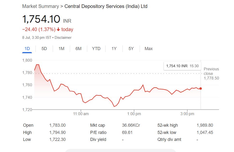 CDSL Share Price: मंगलवार, 8 जुलाई 2025 को सेंट्रल डिपॉजिटरी सर्विसेज (इंडिया) लिमिटेड (CDSL) के शेयर में हल्की गिरावट देखने को मिली है। यह शेयर -1.37 फीसदी गिरकर 1,740 रुपये के स्तर पर ट्रेड करते हुए बंद हुआ। वहीं आज ट्रेडिंग की शुरुआत में यह 1,783 रुपये पर ओपन हुआ और दिन का उच्चतम स्तर 1,794.90 रुपये तथा न्यूनतम स्तर 1,722.30 रुपये रहा। इस गिरावट के बावजूद, यह स्टॉक ब्रेकआउट की दहलीज पर खड़ा है और निवेशकों को शानदार रिटर्न देने की क्षमता रखता है।
