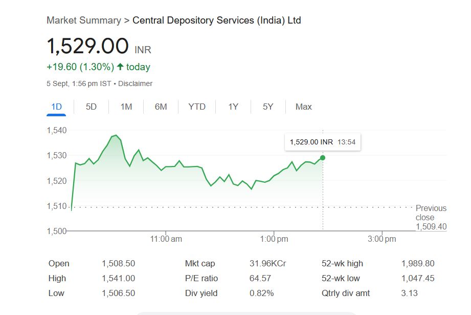 आज शुक्रवार, 5 सितंबर 2025 के दिन सेंसेक्स-निफ्टी में उतार-चढ़ाव के बीच सेंट्रल डिपॉजिटरी सर्विसेज (इंडिया) लिमिटेड कंपनी का शेयर 1529.00 रुपये पर कारोबार कर रहा है। पिछला क्लोजिंग प्राइस 1509.40 रुपये के स्तर से शेयर 1.30% की तेजी के साथ ट्रेड कर रहा है। शुक्रवार को सुबह स्टॉक मार्केट में ट्रेडिंग शुरू होते ही सेंट्रल डिपॉजिटरी सर्विसेज (इंडिया) शेयर 1508.50 रुपये पर खुला था। आज दोपहर 1.56 बजे तक सेंट्रल डिपॉजिटरी सर्विसेज (इंडिया) कंपनी शेयर ने दिन का 1541 रुपये का हाई लेवल को छुआ। वहीं, शुक्रवार को शेयर का लो-लेवल 1506.50 रुपये था।