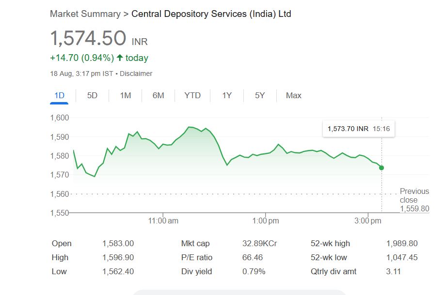 - CDSL का शेयर आज 0.94% चढ़कर ₹1574.50 पर