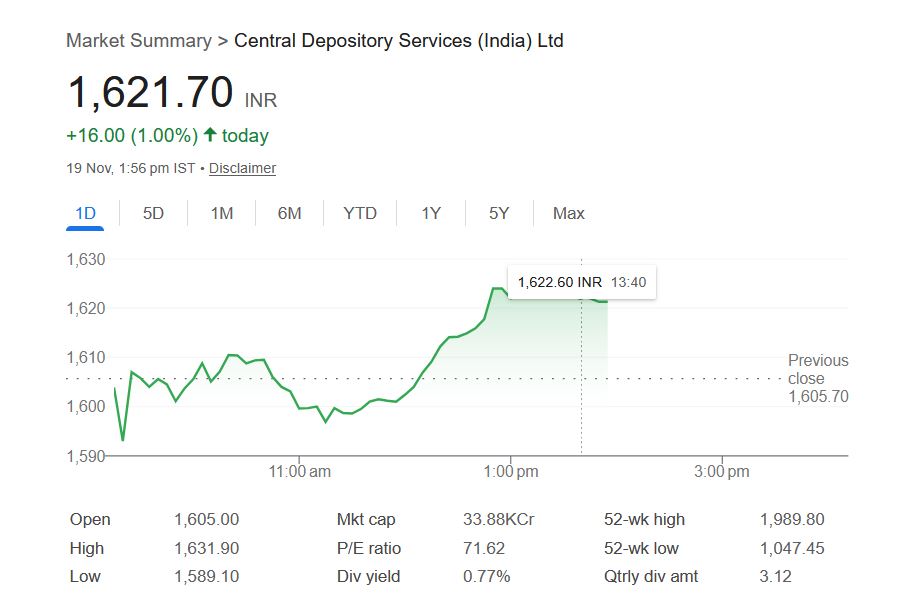 - CDSL शेयर आज 1% की बढ़त के साथ 1,621.70 रुपये पर ट्रेड हुआ।