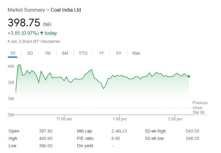 कोल इंडिया लिमिटेड के शेयर में भी शुक्रवार को हल्की तेजी दर्ज की गई। यह शेयर 0.97% की बढ़त के साथ 398.75 रुपये पर कारोबार कर रहा था। ट्रेडिंग की शुरुआत 397.85 रुपये पर हुई और सुबह 11:35 बजे तक यह 400.60 रुपये के दिन के उच्चतम स्तर तक पहुंच गया। आज का न्यूनतम स्तर 396.05 रुपये रहा।