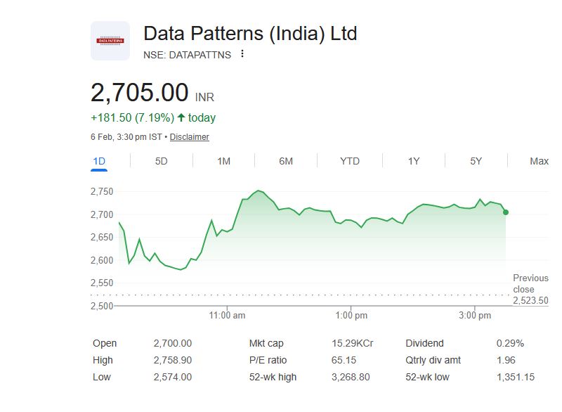 नई दिल्ली: Data Patterns Ltd Share Price Today डिफेंस और एयरोस्पेस सेक्टर की प्रमुख कंपनी डाटा पैटर्न्स (इंडिया) लिमिटेड ने हाल ही में अपने तिमाही परिणामों का ऐलान किया। इसके बाद कंपनी के शेयरों में जबरदस्त तेजी देखी गई और शुक्रवार को इस डिफेंस स्टॉक में खरीदारी की होड़ मच गई। नतीजों को बाद कंपनी का शेयर 9 प्रतिशत से अधिक बढ़कर 2758.90 रुपये के इंट्रा-डे हाई तक पहुंच गया।