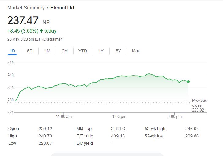 - इटरनल लिमिटेड का शेयर 3.75% उछलकर 237.60 रुपये पर कारोबार कर रहा है।