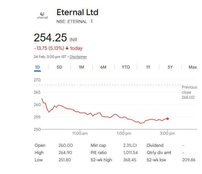 Eternal Share Price Fall: इटरनल के शेयर में गिरावट! 5 दिन की लगातार बिकवाली से निवेशकों की मुश्किलें बढ़ी, आखिर क्या है इसके गिरने की असली वजह?