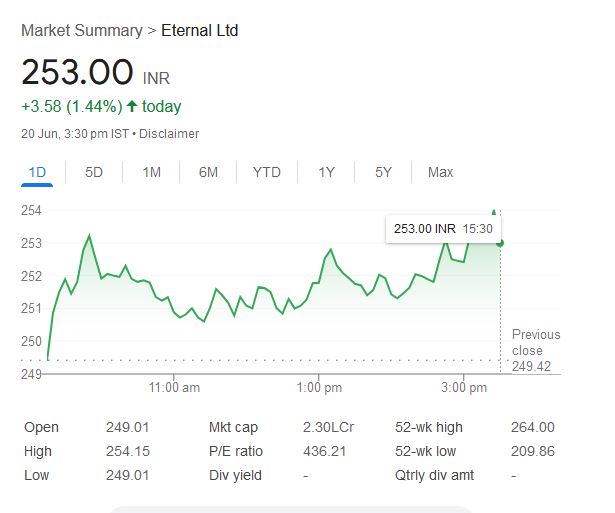 इटरनल लिमिटेड के शेयर का पिछले 52 हफ्तों में उच्चतम स्तर 264 रुपये और न्यूनतम स्तर 209.86 रुपये रहा है। कंपनी का मौजूदा मार्केट कैप अब बढ़कर 2.30 लाख करोड़ रुपये तक पहुंच चुका है। स्टॉक का P/E रेशियो 436.21 है, जो इसकी ऊंची वैल्यूएशन को दर्शाता है।