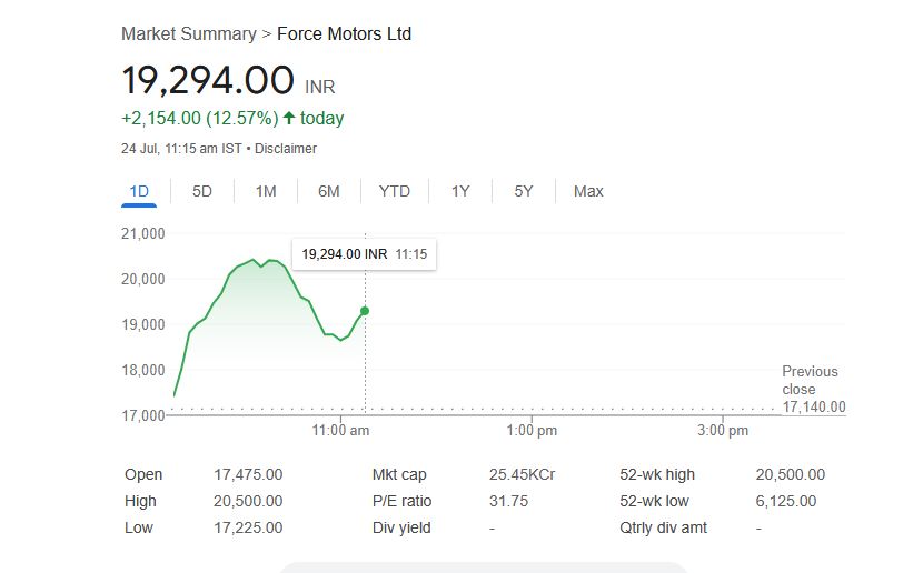 Force Motors Share Price: गुरुवार, 24 जुलाई को स्मॉलकैप ऑटो कंपनी फोर्स मोटर्स के शेयरों में जबरदस्त उछाल देखने को मिली है। बीएसई पर कंपनी का शेयर 20% उछलकर 20,500 रुपये के ऑल-टाइम हाई पर पहुंच गया है। सिर्फ एक महीने में ही इसमें 49% से ज्यादा की तेजी आ चुकी है। अब खास बात यह है कि बीते 6 महीनों में निवेशकों का पैसा तीन गुना से भी अधिक हो गया, क्योंकि शेयर 213% उछल चुका है।