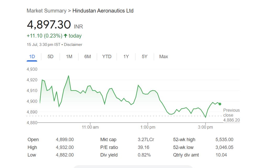 मंगलवार, 15 जुलाई 2025 को हिंदुस्तान एयरोनॉटिक्स लिमिटेड कंपनी का शेयर एनएसई पर 4,899 रुपये से 4,932 रुपये के बीच कारोबार करता नजर आया और दिन के अंत में 0.23% की तेजी के साथ 4,897.30 रुपये पर बंद हुआ। यह हल्की तेजी के बावजूद अब भी उच्च स्तरों पर बना हुआ है।