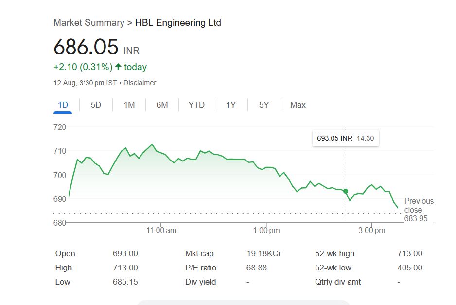 मंगलवार, 12 अगस्त को एचबीएल इंजीनियरिंग का शेयर 693.75 रुपये पर ओपन हुआ और दिन के दौरान 713.65 रुपये तक पहुंच गया। यह कंपनी के 52 सप्ताह के उच्च स्तर 738.65 रुपये के बहुत करीब है। वहीं, 52 सप्ताह के लो लेवल 404.30 रुपये दर्ज किया गया है। कंपनी का मौजूदा मार्केट कैप 19,050 करोड़ रुपये है।