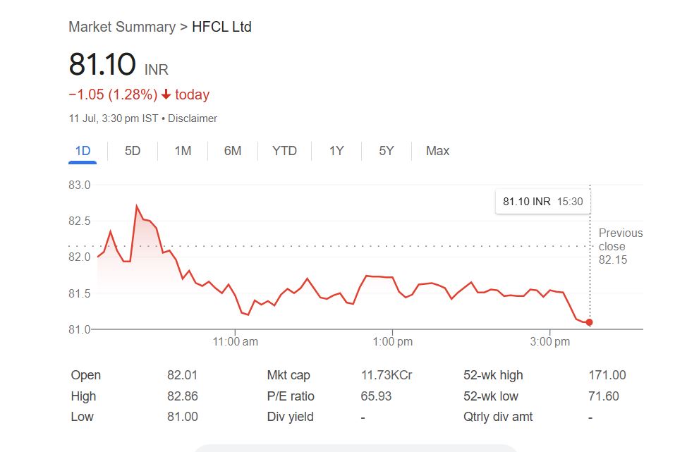 HFCL Share Price: एचएफसीएल लिमिटेड एक मिडकैप टेलीकॉम और टेक्नोलॉजी कंपनी है जो 5G इन्फ्रास्ट्रक्चर और ऑप्टिकल फाइबर नेटवर्किंग के क्षेत्र में कार्य कर रही है। शुक्रवार, 11 जुलाई 2025 को एचएफसीएल कंपनी का शेयर -1.28% की गिरावट के साथ 81.10 रुपये पर बंद हुआ था। दिन के दौरान यह शेयर 82.86 रुपये के हाई और 81.00 रुपये के लो लेवल पर कारोबार करता दिखा। कंपनी का 52 हफ्ते का हाई 171 रुपये और लो 71.60 रुपये है।