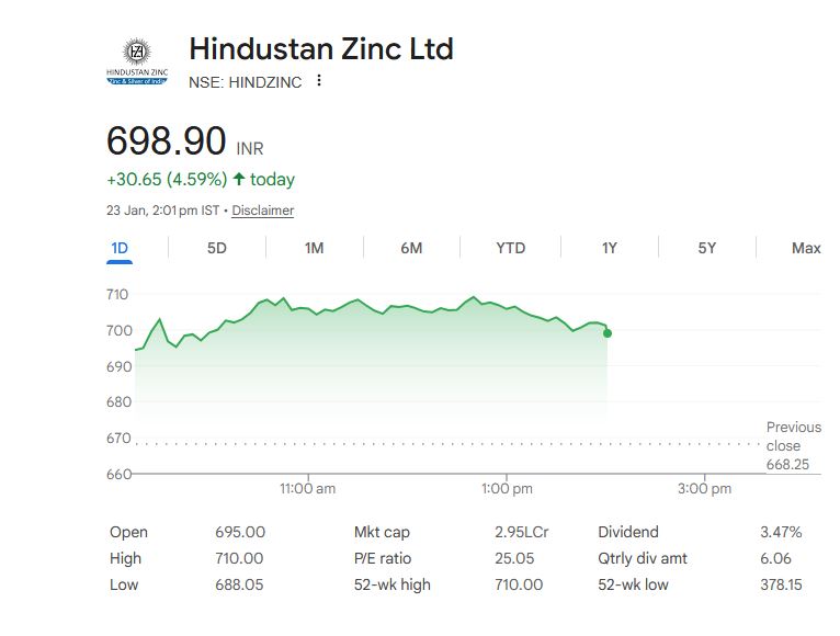 दरअसल, आज 23 जनवरी 2026 को बीएसई पर हिंदुस्तान जिंक का शेयर (Hindustan Zinc Ltd Share) 695 रुपये के स्तर पर खुला। ट्रेडिंग के दौरान इसमें तेज खरीदारी देखने को मिली और शेयर 6.24 प्रतिशत की तेजी के साथ 710 रुपये के स्तर तक पहुंच गया, जो इसका 52 हफ्तों का उच्चतम स्तर है। दोपहर करीब 2 बजे शेयर 4.59 प्रतिशत की बढ़त के साथ 698.90 रुपये पर कारोबार कर रहा था। बीते 6 महीनों में इस शेयर ने करीब 56 प्रतिशत का शानदार रिटर्न दिया है।