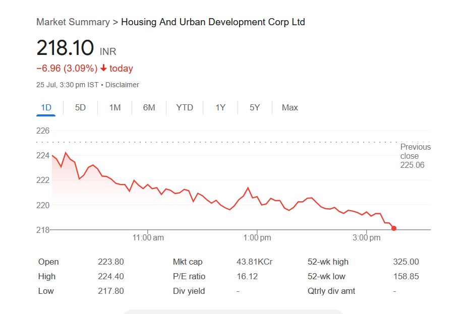 HUDCO Share Price: शुक्रवार को हाउसिंग एंड अर्बन डेवलपमेंट कॉरपोरेशन लिमिटेड कंपनी के शेयर 3.09 प्रतिशत फिसल गई और यह शेयर 218.10 रुपये पर ट्रेड करते हुए बंद हुआ था। शुक्रवार, 25 जुलाई 2025 को ओपनिंग बेल पर ट्रेडिंग शुरू होते ही हाउसिंग एंड अर्बन डेवलपमेंट कॉरपोरेशन कंपनी शेयर 223.80 रुपये पर खुला था और दोपहर 3.30 बजे तक हाउसिंग एंड अर्बन डेवलपमेंट कॉरपोरेशन कंपनी के शेयर 224.40 रुपये के इंट्रा-डे हाई लेवल तक पहुंच गया। वहीं, इस शेयर का लो लेवल 217.80 रुपये था।