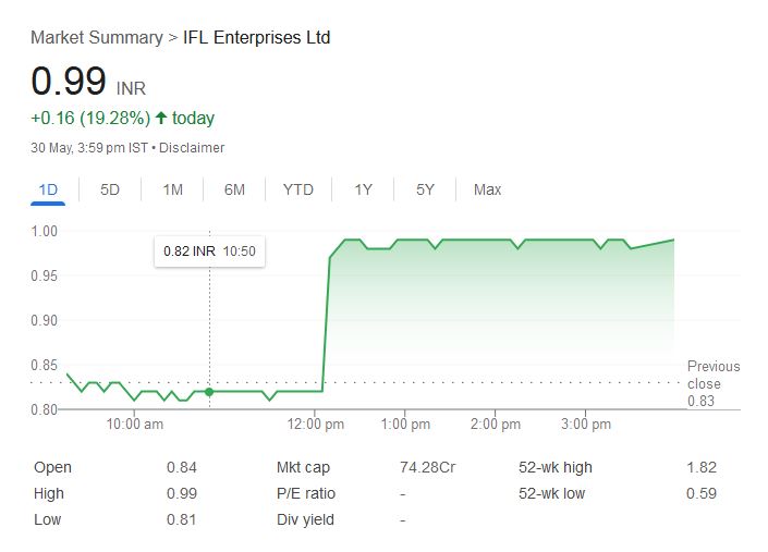 शेयर के भाव में यह उछाल कंपनी के शानदार तिमाही नतीजों के बाद देखने को मिला। शुक्रवार को IFL एंटरप्राइजेज का शेयर 84 पैसे पर खुला और तेजी के सात 0.99 रुपये तक पहुंच गया, जबकि पिछले कारोबारी दिन यह 83 पैसे पर बंद हुआ था। गौरतलब है कि 29 मई को भी यह शेयर 5% उछाल के साथ बंद हुआ था।
