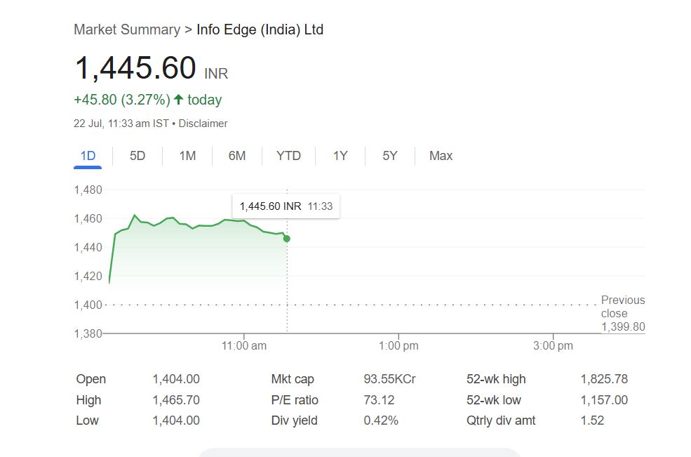 InFo Edge Share Price: आज मंगलवार, 22 जुलाई 2025 को Info Edge (India) Ltd के स्टॉक्स में बड़ी उछाल दर्ज की गई है। कंपनी के शेयर की कीमत करीब 4% उछलकर 1,465.70 रुपये के स्तर तक पहुंच गई। इस बढ़ोतरी के पीछे की मुख्य वजह Eternal (पूर्व में Zomato) के पहली तिमाही के नतीजे और इसमें Info Edge की मजबूत हिस्सेदारी को माना जा रहा है। Info Edge के पास वर्तमान में Eternal में 12.38 प्रतिशत हिस्सेदारी है, जो करीब 119 करोड़ शेयरों के बराबर है।