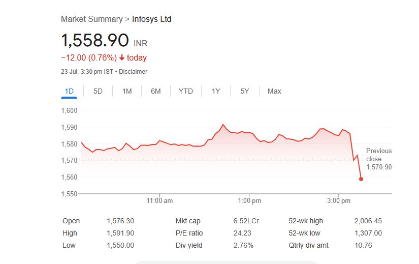 हालांकि बेहतर तिमाही नतीजों के बावजूद इंफोसिस के शेयर 23 जुलाई को NSE पर 0.76% फिसलकर 1,558.90 रुपये पर बंद हुए। इस साल अब तक कंपनी के शेयरों में लगभग 17.19% की गिरावट दर्ज की जा चुकी है।