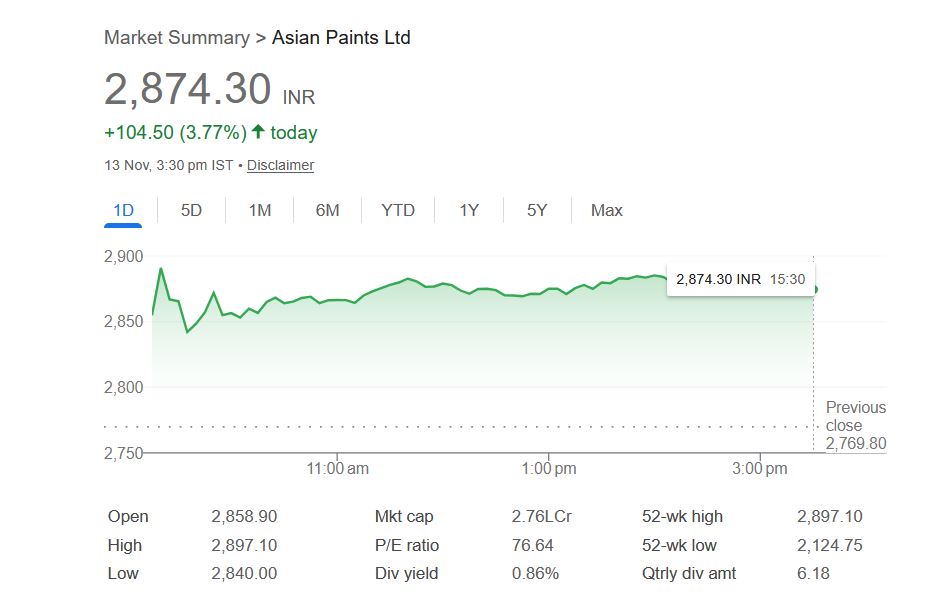 - 13 नवंबर को एशियन पेंट्स ₹2,874.30 पर बंद हुआ।