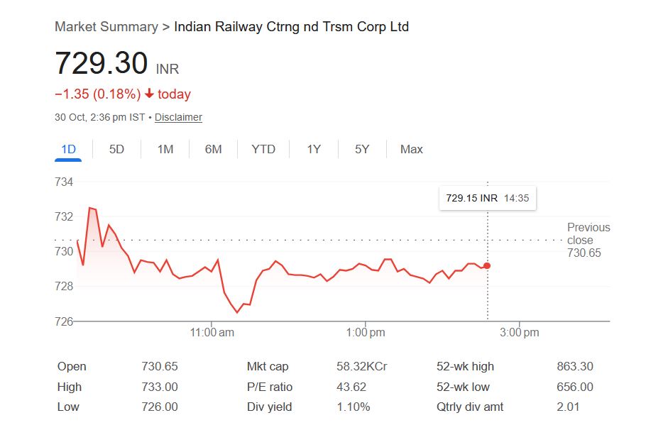 - IRCTC का शेयर आज ₹729.30 पर पहुंचा।