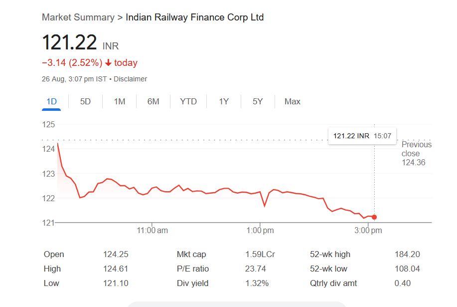 - IRFC शेयर ₹121.22 पर -2.52% गिरा।