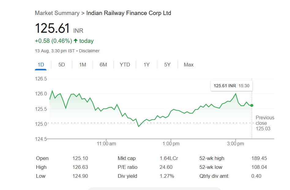आज बुधवार, 13 अगस्त 2025 तक इंडियन रेलवे फाइनेंस कॉर्पोरेशन लिमिटेड कंपनी शेयर का 52 हफ्ते का उच्च स्तर 189.45 रुपये है। जबकि, इस शेयर का 52 हफ्ते का निचला स्तर 108.04 रुपये है। यह स्टॉक अपने 52-सप्ताह के उच्च स्तर से -33.64% लुढ़क गया है। वहीं, 52-सप्ताह के निचले स्तर से 16.36% की बढ़त दर्ज की गई है। इस दौरान इंडियन रेलवे फाइनेंस कॉर्पोरेशन कंपनी का कुल मार्केट कैप 1,64,663 करोड़ रुपये हो गया है। आज बुधवार तक इंडियन रेलवे फाइनेंस कॉर्पोरेशन कंपनी पर 4,04,813 करोड़ रुपये का कर्ज है।