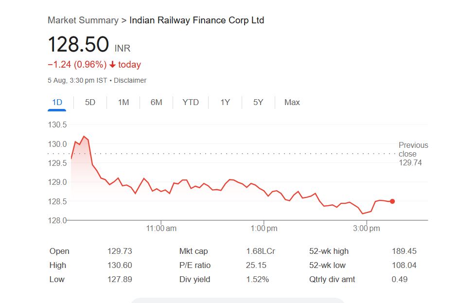 IRFC Share Price: आज, मंगलवार, 5 अगस्त 2025 को इंडियन रेलवे फाइनेंस कॉर्पोरेशन लिमिटेड कंपनी का शेयर -0.96 प्रतिशत फिसलकर 128.50 रुपये पर ट्रेड करते हुए बंद हुआ। आज सुबह शेयर बाजार में ट्रेडिंग शुरू होते ही इंडियन रेलवे फाइनेंस कॉर्पोरेशन शेयर 129.73 रुपये पर खुला था। जो आज दोपहर 3.30 बजे तक इंडियन रेलवे फाइनेंस कॉर्पोरेशन कंपनी शेयर का हाई-लेवल 130.60 रुपये और लो-लेवल 127.89 रुपये रहा।