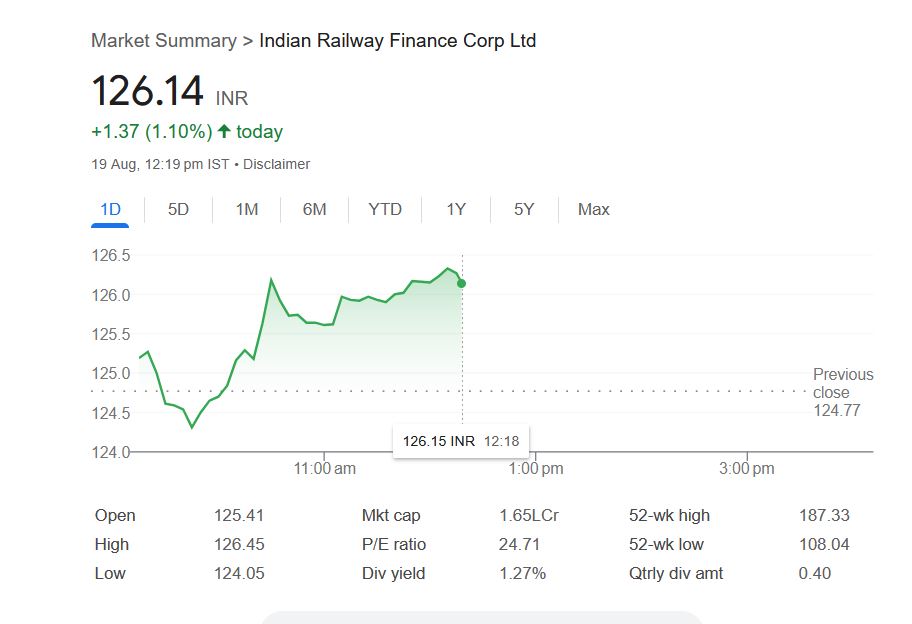 - IRFC शेयर आज ₹126.14 पर 1.10% की तेजी में।