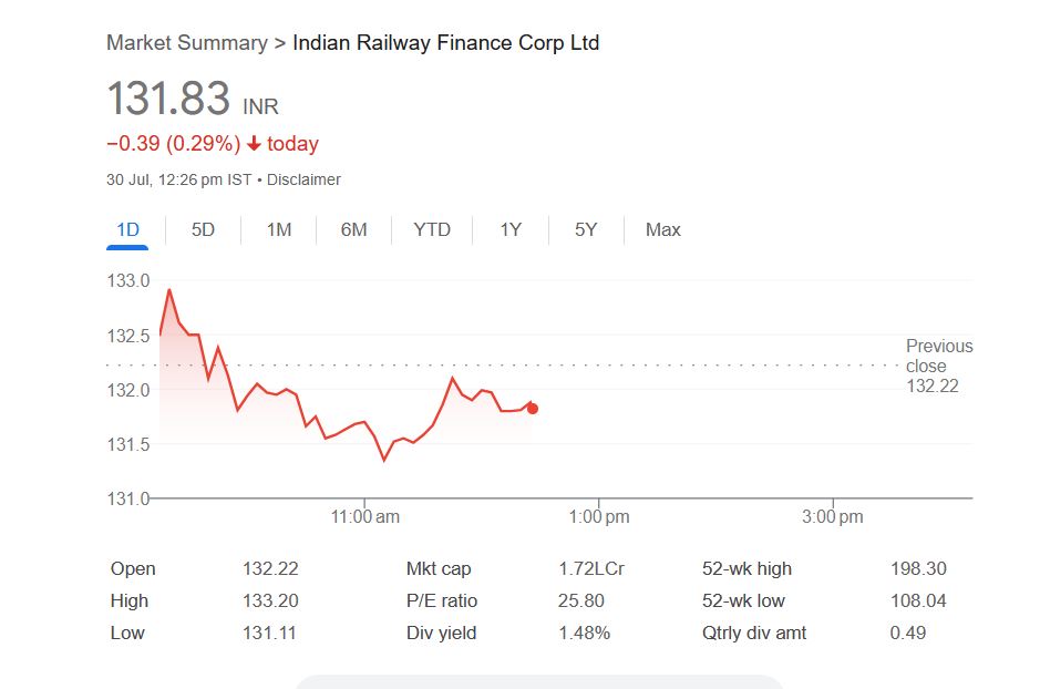 IRFC Share Price: आज, बुधवार, 30 जुलाई 2025 के दिन इंडियन रेलवे फाइनेंस कॉर्पोरेशन लिमिटेड कंपनी का शेयर 0.29% फिसलकर 131.83 रुपये पर कारोबार कर रहा है। आज सुबह शेयर बाजार में ट्रेडिंग शुरू होते ही इंडियन रेलवे फाइनेंस कॉर्पोरेशन शेयर 132.22 रुपये पर खुला था। जो आज दोपहर 12.26 बजे तक इंडियन रेलवे फाइनेंस कॉर्पोरेशन कंपनी शेयर का इंट्रा डे हाई-लेवल 133.20 रुपये और लो-लेवल 131.11 रुपये था।