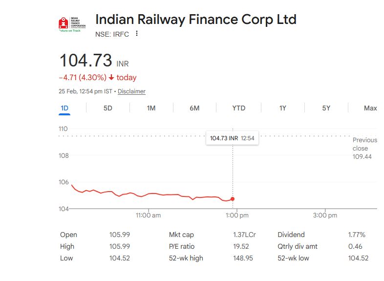 नई दिल्ली: IRFC Share Price आज बुधवार 25 फरवरी को इंडियन रेलवे फाइनेंस कॉरपोरेशन (IRFC) के शेयरों में दिन के दौरान 4 प्रतिशत तक की गिरावट देखने को मिली। BSE पर शेयर 104.52 रुपये के न्यूनतम स्तर तक पहुंच गया, जो इस साल का 52-सप्ताह का नया निचला स्तर है। गिरावट के पीछे मुख्य कारण है सरकार द्वारा IRFC में 4% हिस्सेदारी का ऑफर फॉर सेल (OFS)। यह OFS 25 फरवरी से संस्थागत निवेशकों के लिए खुला और खुदरा निवेशक 26 फरवरी से इसमें हिस्सा ले सकते हैं।