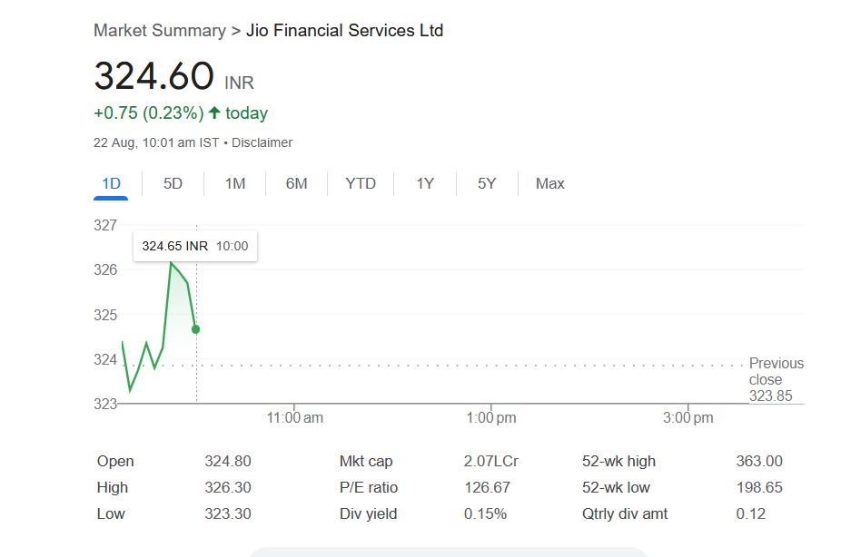 शुक्रवार, 22 अगस्त 2025 के दिन सेंसेक्स-निफ्टी में उतार-चढ़ाव के बीच जियो फाइनेंशियल सर्विसेज लिमिटेड कंपनी का शेयर 324.60 रुपये पर कारोबार कर रहा है। पिछला क्लोजिंग प्राइस 323.85 रुपये के स्तर से शेयर 0.23% की उछाल के साथ ट्रेड कर रहा है। आज सुबह स्टॉक मार्केट में ट्रेडिंग शुरू होते ही जियो फाइनेंशियल सर्विसेज शेयर 324.80 रुपये पर खुला था। आज सुबह 10:03 बजे तक जियो फाइनेंशियल सर्विसेज कंपनी शेयर ने दिन के 326.30 रुपये के इंट्रा डे हाई लेवल को छुआ। वहीं, आज शेयर का लो-लेवल 323.30 रुपये था। 125.95