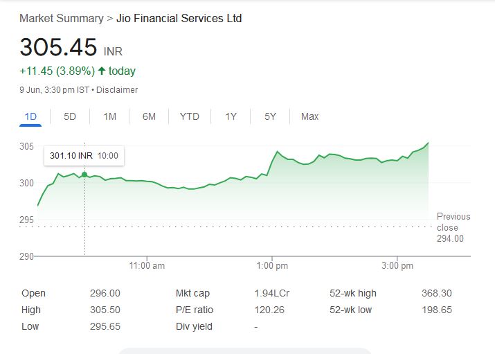 Jio Finance Share Price: सोमवार, 9 जून 2025 को जियो फाइनेंशियल सर्विसेज लिमिटेड के शेयरों में अच्छी वृद्धि देखी गई। कंपनी का स्टॉक 3.89% की बढ़ोतरी के साथ 305.45 रुपये पर ट्रेड करता नजर आया। दिन की शुरुआत में यह शेयर 296 रुपये पर बाजार खुला था और कारोबार के दौरान 305.50 रुपये के उच्च स्तर और 295.65 रुपये के निम्न स्तर को छू चुका है।