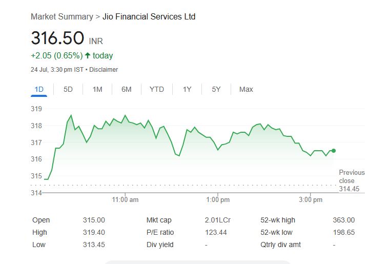 Jio Finance Share Price: गुरुवार, 24 जुलाई 2025 के दिन सेंसेक्स-निफ्टी में उतार-चढ़ाव के बीच जियो फाइनेंशियल सर्विसेज लिमिटेड कंपनी का शेयर 316.50 रुपये पर कारोबार कर रहा हैं। पिछले बंद मूल्य 314.45 रुपये के स्तर से शेयर 0.65% की उछाल के साथ ट्रेड कर रहा है। गुरुवार को सुबह स्टॉक मार्केट में ट्रेडिंग शुरू होते ही जियो फाइनेंशियल सर्विसेज शेयर 315 रुपये पर खुला था। जो आज दोपहर तक जियो फाइनेंशियल सर्विसेज कंपनी शेयर ने दिन के 319.40 रुपये के हाई को लेवल छुआ। वहीं, गुरुवार को शेयर का लो-लेवल 313.45 रुपये था।