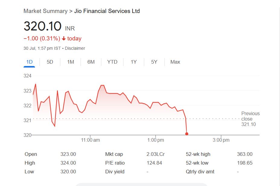 पिछले क्लोजिंग प्राइस 321.10 रुपये के मुकाबले जियो फाइनेंशियल सर्विसेज के शेयर आज 320.10 रुपये पर गिरावट के साथ कारोबार कर रहा है। आज बुधवार, 30 जुलाई 2025 को दोपहर 1:57 बजे तक जियो फाइनेंशियल सर्विसेज कंपनी के शेयर 320.25 रुपये से 324.00 रुपये के दायरे में कारोबार करता नजर आया।