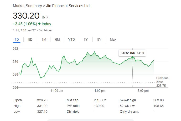 Jio Finance Share Price: मंगलवार, 1 जुलाई 2025 के दिन सेंसेक्स-निफ्टी में पॉजिटिव रुझान के बीच जियो फाइनेंशियल सर्विसेज लिमिटेड कंपनी का शेयर 330.20 रुपये पर ट्रेड करते हुए बंद हुआ। पिछले बंद मूल्य 326.75 रुपये के स्तर से शेयर 1.06% की तेजी के साथ कारोबार कर रहा था। आज, मंगलवार को सुबह शेयर मार्केट में ट्रेडिंग शुरू होते ही जियो फाइनेंशियल सर्विसेज शेयर 328.20 रुपये पर खुला था। आज दोपहर 3.30 PM तक जियो फाइनेंशियल सर्विसेज कंपनी शेयर ने दिन का 331.90 रुपये का हाई लेवल और 327.10 रुपये के लो-लेवल को छूआ था।