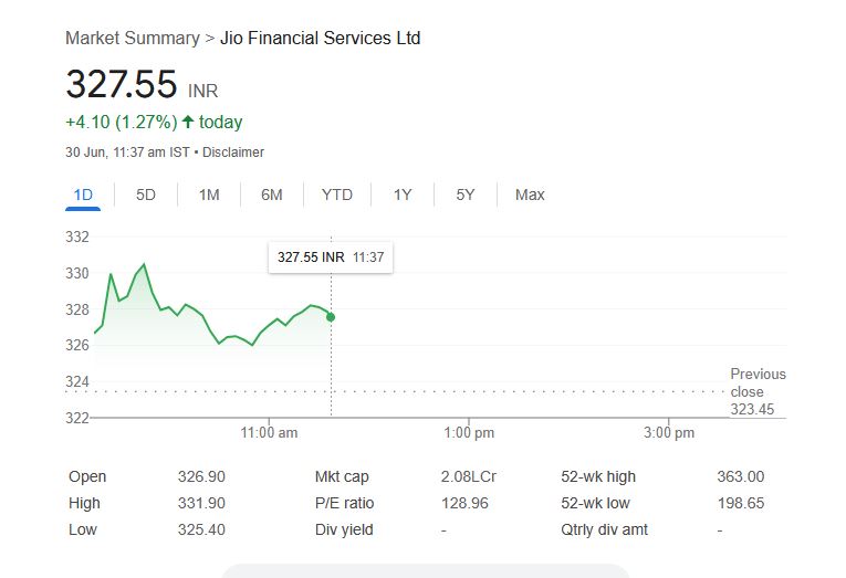 Jio finance share price: आज सोमवार, 30 जून 2025 को जियो फाइनेंशियल के शेयरों में शानदार तेजी देखी जा रही है। यह लगातार पांचवें दिन शेयर में तेजी आई है और इन 5 दिनों में इसने करीब 13% की बढ़ोतरी दर्ज की है। इस बढ़ोतरी की वजह कंपनी के अलग-अलग बिजनेस को लगातार मिल रही मंजूरियों को माना जा रहा है।