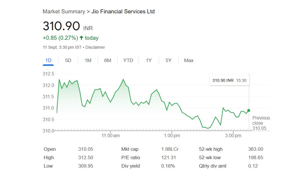 आज, गुरुवार, 11 सितंबर 2025 को जियो फाइनेंशियल सर्विसेज लिमिटेड कंपनी का शेयर 0.27 प्रतिशत की तेजी के साथ 310.90 रुपये पर कारोबार कर रहा है। आज सुबह शेयर बाजार में ट्रेडिंग शुरू होते ही जियो फाइनेंशियल सर्विसेज शेयर 310.05 रुपये पर ओपन हुआ था। जो आज दोपहर 3.30 बजे तक जियो फाइनेंशियल सर्विसेज कंपनी शेयर का इंट्रा-डे हाई-लेवल 312.50 रुपये और लो-लेवल 309.95 रुपये रहा।