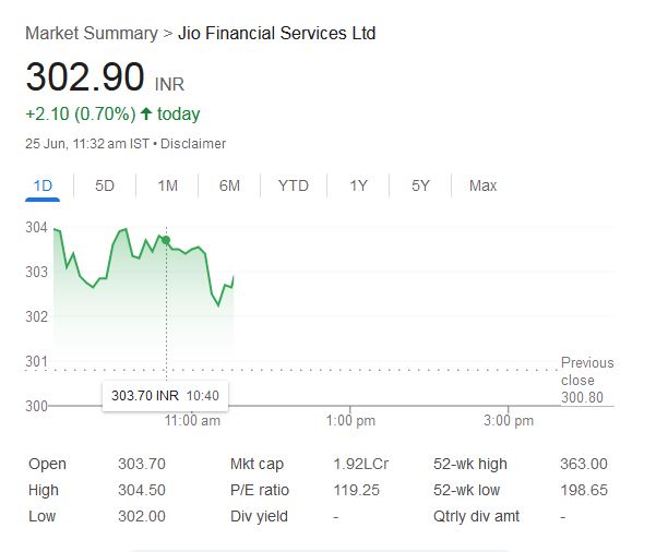 Jio Finance Share Price: बुधवार, 25 जून 2025 को सेंसेक्स-निफ्टी की इस उठा-पटक में जियो फाइनेंशियल सर्विसेज लिमिटेड कंपनी का शेयर सुबह 11:32 AM तक 302.90 रुपये पर ट्रेड कर रहा हैं। पिछले बंद मूल्य 300.80 रुपये के स्तर से शेयर 0.70% की बढ़त के साथ ट्रेड कर रहा हैं। बुधवार को सुबह स्टॉक मार्केट में ट्रेडिंग शुरू होते ही जियो फाइनेंशियल सर्विसेज शेयर 303.70 रुपये पर खुला। आज सुबह 11:32 AM तक जियो फाइनेंशियल सर्विसेज कंपनी शेयर ने दिन का हाई लेवल 304.5 रुपये और लो-लेवल 302 रुपये था।