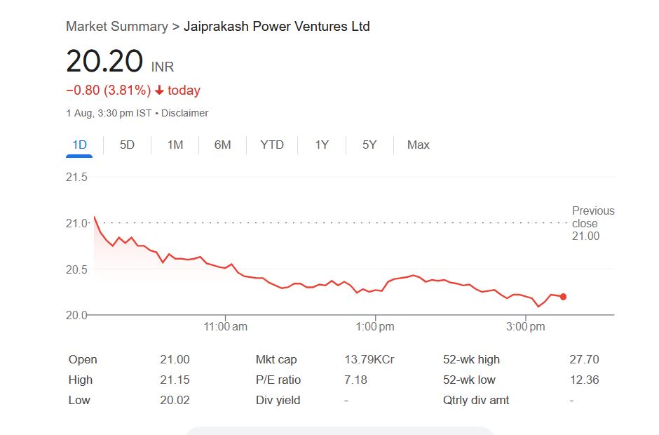 - JP पावर शेयर ₹21 से गिरकर ₹20.20 पर पहुंचा