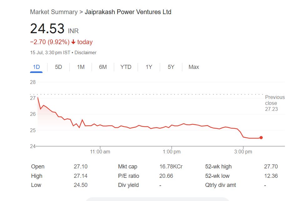 JP Power Share Price: आज, मंगलवार, 15 जुलाई 2025 को जयप्रकाश पावर वेंचर्स लिमिटेड कंपनी के शेयर 9.92 प्रतिशत की गिरावट के साथ 24.53 रुपये पर कारोबार करते हुए बंद हुआ। आज सुबह शेयर मार्केट में ट्रेडिंग शुरू होते ही जयप्रकाश पावर वेंचर्स शेयर 27.10 रुपये पर खुला था। जो आज दोपहर तक जयप्रकाश पावर वेंचर्स कंपनी के शेयर ने दिन के 27.14 रुपये के हाई लेवल को छुआ। वहीं, मंगलवार को शेयर का लो-लेवल 24.50 रुपये रहा।