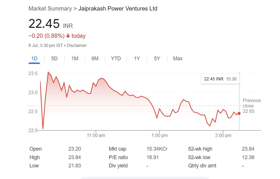 JP Power Share Price: मंगलवार, 8 जुलाई 2025 को कर्ज में डूबे जयप्रकाश एसोसिएट्स की सहायक कंपनी जयप्रकाश पावर वेंचर्स (JP Power) के शेयरों ने बाजार में शानदार प्रदर्शन किया। सप्ताह के दूसरे कारोबारी दिन कंपनी के शेयरों ने 23.84 रुपये के स्तर को छूकर 52 सप्ताह का हाई दर्ज किया। हालांकि, इसके तुरंत बाद मुनाफावसूली के चलते शेयर 23 रुपये से नीचे लुढ़क गया। गौरतलब है कि कभी जेपी पावर शेयर जनवरी 2008 में 143.40 रुपये तक भी पहुंच चुका है और अब यह करीब 84% की छूट पर कारोबार कर रहा है। फिर भी, बाजार विश्लेषक इस स्टॉक को लेकर सकारात्मक हैं और इसमें आने वाले समय में बड़ी उछाल की संभावना जताई है।