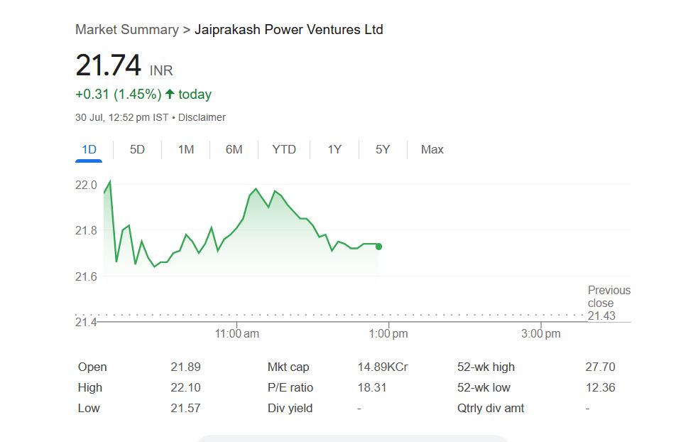 JP Power Share Price: आज, बुधवार, 30 जुलाई 2025 के दिन जयप्रकाश पावर वेंचर्स लिमिटेड कंपनी का शेयर 1.45 प्रतिशत उछलकर 21.74 रुपये पर कारोबार कर रहा है। आज सुबह शेयर बाजार में ट्रेडिंग शुरू होते ही जयप्रकाश पावर वेंचर्स शेयर 21.89 रुपये पर खुला था। जो आज दोपहर 12.52 बजे तक जयप्रकाश पावर वेंचर्स कंपनी शेयर का इंट्रा डे हाई-लेवल 22.10 रुपये और लो-लेवल 21.57 रुपये था।