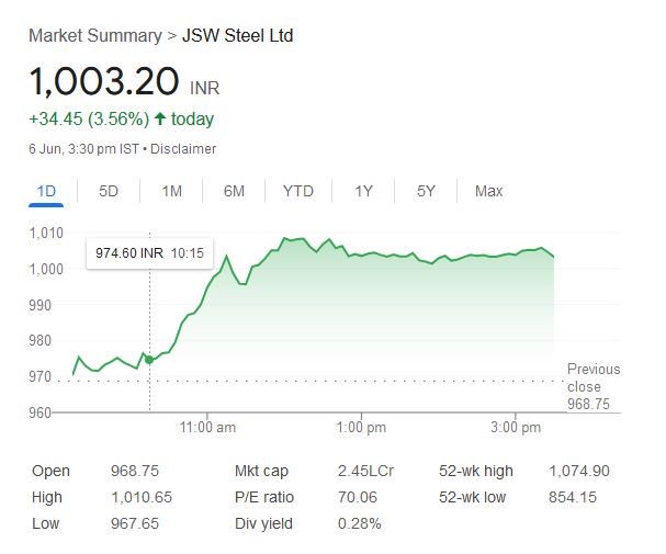 JSW Steel Share Price: शुक्रवार, 6 जून 2025 को JSW Steel लिमिटेड के शेयरों में जबरदस्त उछाल देखने को मिला है। कंपनी का स्टॉक 3.56% की मजबूती के साथ 1,003.20 के स्तर पर ट्रेड करता दिखा। ट्रेडिंग सेशन की शुरुआत शेयर ने 968.75 रुपये पर की थी, जबकि दिन के दौरान यह 1,010.65 रुपये के उच्चतम स्तर तक पहुंच गया। वहीं, दिन का न्यूनतम स्तर 967.65 रुपये रहा।