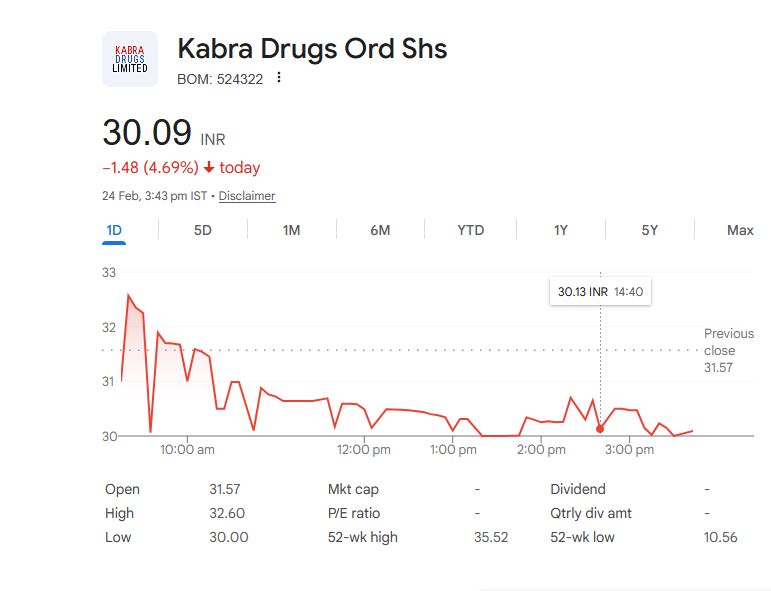 Kabra Drugs Share – आज का शेयर प्रदर्शन (24 फरवरी 2026)