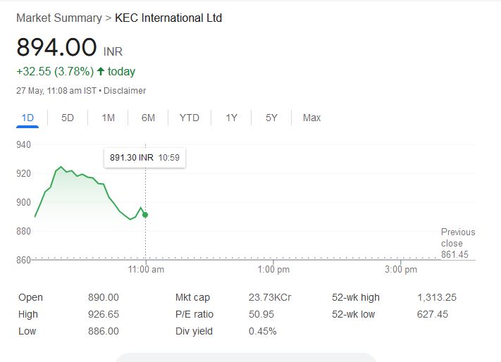 KEC का शेयर आज BSE पर 890.00 रुपये पर खुला, जो पिछली क्लोजिंग के मुकाबले करीब 4% ऊंचा था। दिन के कारोबार के दौरान स्टॉक 926.65 रुपये के उच्च स्तर तक गया, जिससे इसकी बढ़त 7% से अधिक रही। कंपनी के शानदार प्रदर्शन और ऑर्डर बुक की मजबूती ने निवेशकों के भरोसे को और मजबूत कर दिया है।