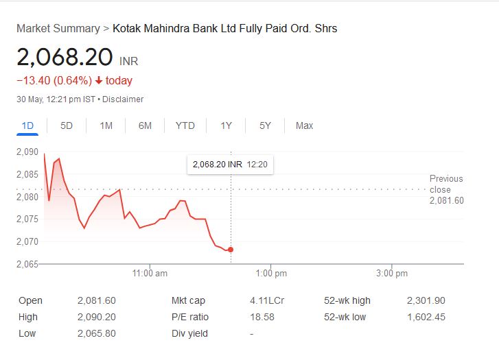 हालांकि, आज घरेलू बाजार में गिरावट रही, लेकिन कोटक महिंद्रा बैंक के शेयरों ने हल्की गिरावट के बावजूद स्थिरता दिखाई। शुक्रवार दोपहर 12:20 PM तक यह शेयर 0.64% की गिरावट के साथ 2,068.20 रुपये पर ट्रेड कर रहा था। शेयर ने दिन की शुरुआत 2,081.60 रुपये के भाव पर की थी और 2,090.20 रुपये का दिन का उच्चतम स्तर छुआ। वहीं, दिन का न्यूनतम स्तर 2,065.80 रुपये रहा।