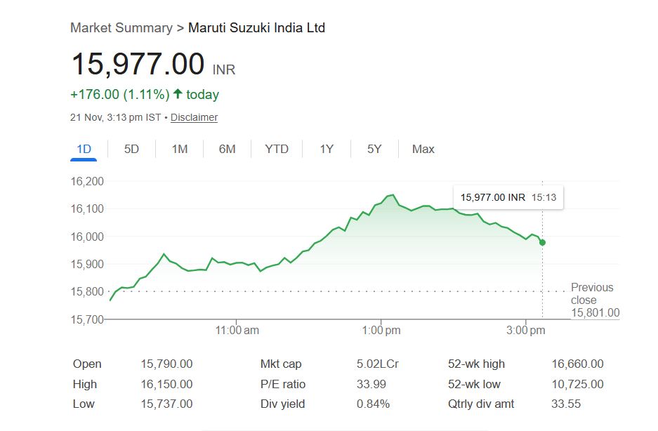 Maruti Suzuki Share Price: कमजोर बाजार के बावजूद ऑटो शेयर मजबूती दिखा रहे हैं और इस रैली को मारुति सुजुकी का शेयर नेतृत्व दे रहा है। 3.13 बजे के आसपास यह शेयर 176 रुपए यानी 1.11% की बढ़त के साथ 15,977 रुपए पर कारोबार कर रहा था। आज का इसका दिन का हाई 16,150 रुपए रहा।